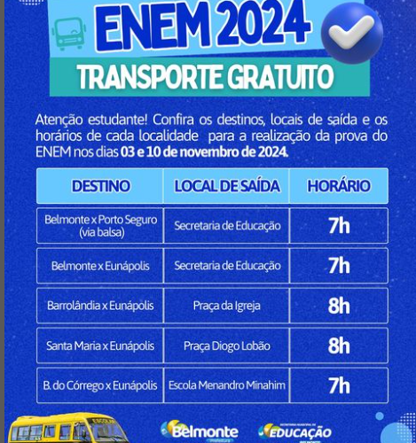 Confira os destinos, locais de saída e os horários de cada localidade para a realização da prova do ENEM nos dias 03 e 10 de novembro de 2024. ✅ Prepare-se para a viagem e organize a sua documentação com antecedência ...
