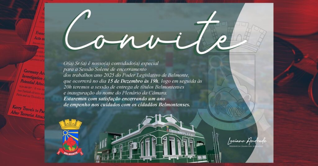 A Câmara Municipal de Vereadores de Belmonte realizará, no próximo dia 15 de dezembro , a Sessão Solene de Encerramento dos Trabalhos do Legislativo , marcada para as 19h , na sede do Parlamento Municipal. O evento é aberto ao público e representa um dos momentos mais importantes do calendário institucional, reunindo autoridades, parlamentares e a comunidade para um balanço das ações desenvolvidas ao longo do ano.