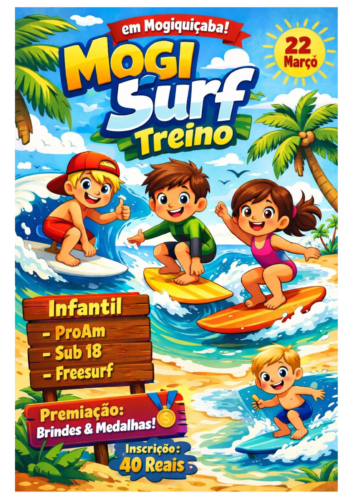 No dia 22 de março, a Praia de Mogiquiçaba será palco do Mogi Surf Treino, um evento esportivo com caráter de treinamento e integração comunitária, voltado ao fortalecimento do surf local e, principalmente, ao incentivo do surf infantil.