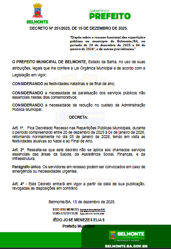 A Prefeitura de Belmonte publicou decreto que estabelece recesso de fim de ano no âmbito da administração pública municipal, no período de 20 de dezembro de 2025 a 4 de janeiro de 2026.