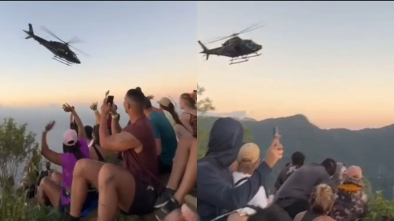 Imagens gravadas por celulares mostram o momento em que um helicóptero da Polícia Civil voou próximo ao grupo.