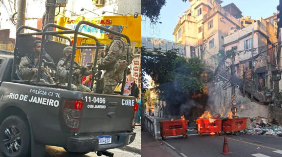 Para dificultar o avanço das tropas, criminosos montaram barricadas com caçambas de lixo incendiadas, o que forçou o COR (Centro de Operações do Rio) a interditar totalmente a avenida Niemeyer, na altura da Passarela do Vidigal.